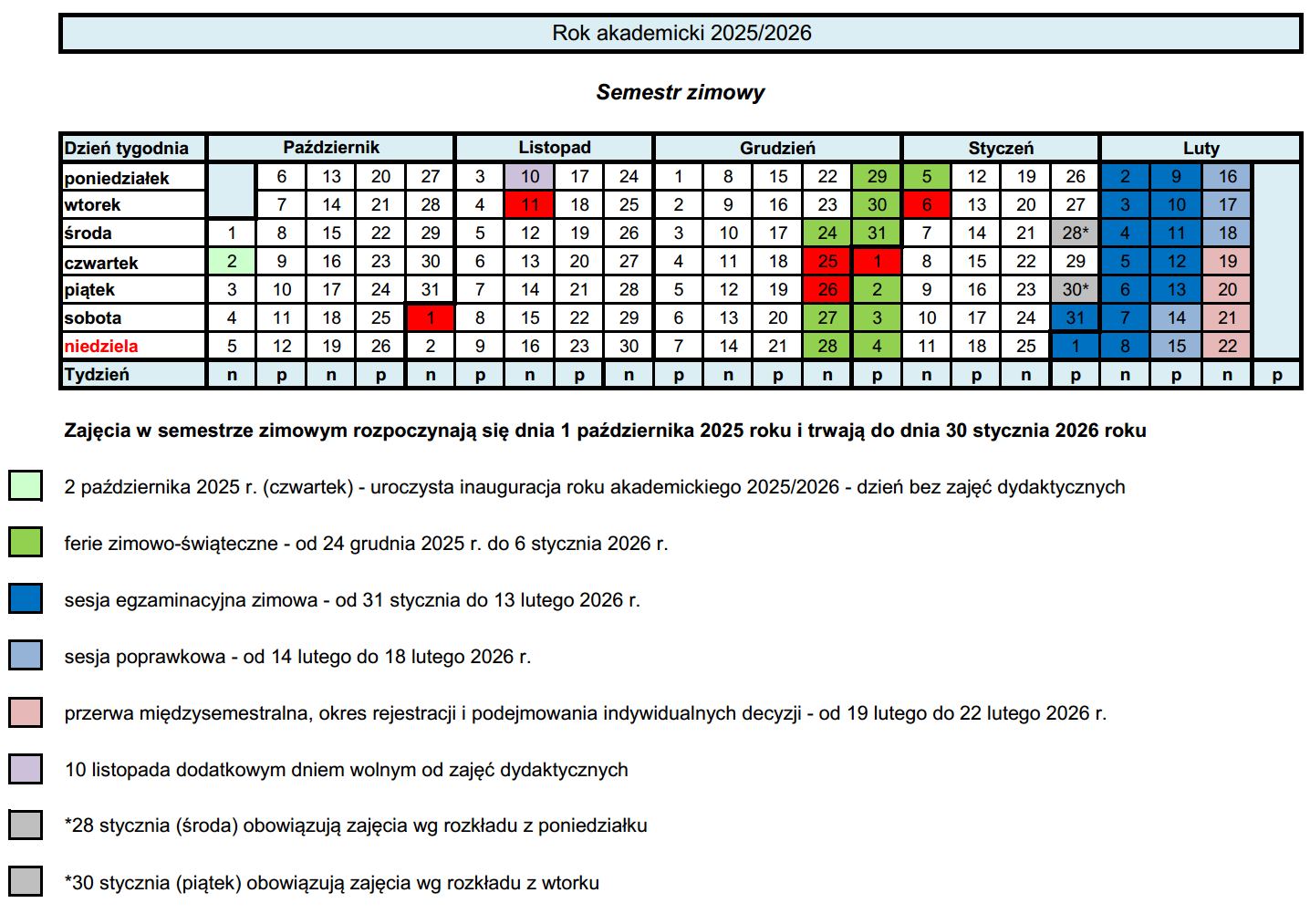 Zajęcia w semestrze zimowym rozpoczynają się dnia 1 października 2025 roku i trwają do dnia 30 stycznia 2026 roku.